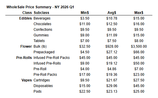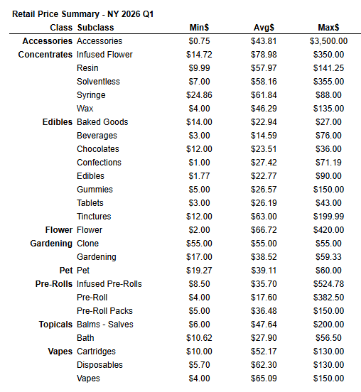 One of the most obvious insights from this dataset is New York’s upper-tier product pricing is significantly higher than in many other adult-use markets—especially more than New Mexico.