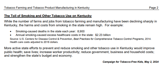 “Tobacco Farming and Product Manufacturing in Kentucky” - Campaign for Tabacco-Free Kids, May 2, 2024, .page 2